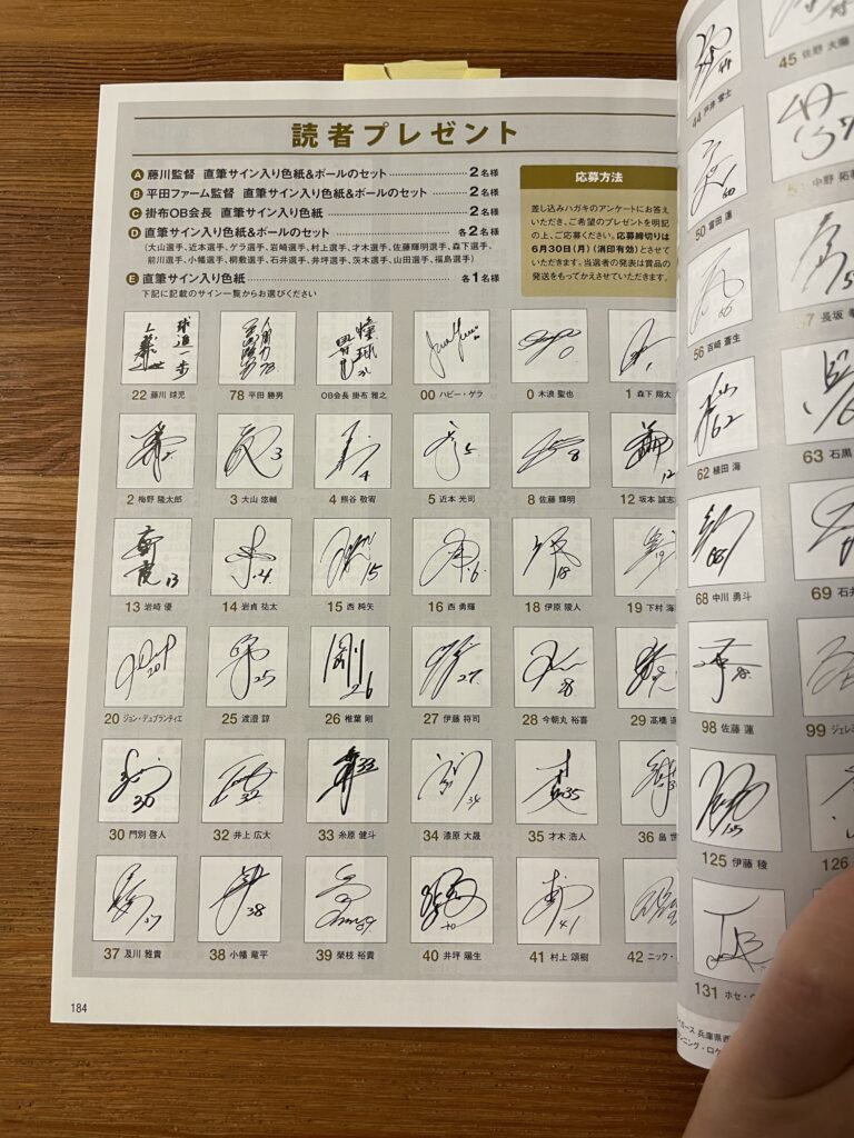 ついに我が家にやってきた。表紙を開くと監督選手コーチが勢揃いした写真が圧巻!各選手を深く掘り下げた記事も読み応えあり。付属のハガキで応募できるサインの読者プレゼントも有り。